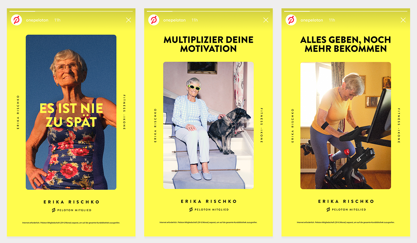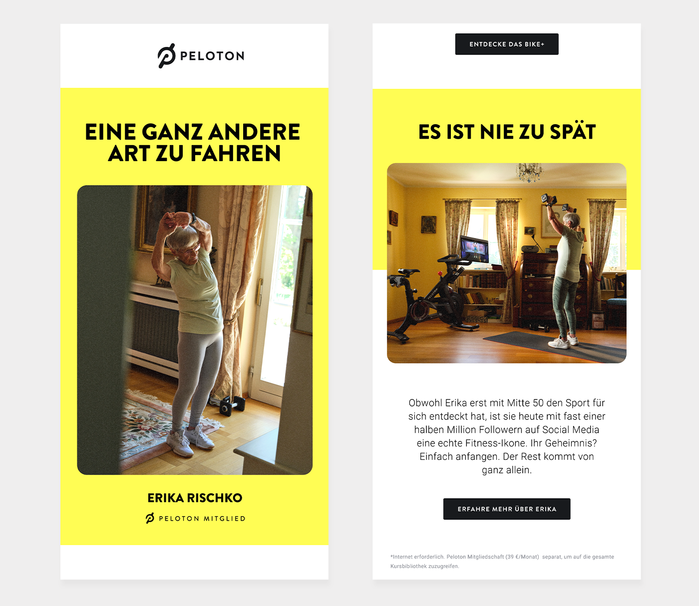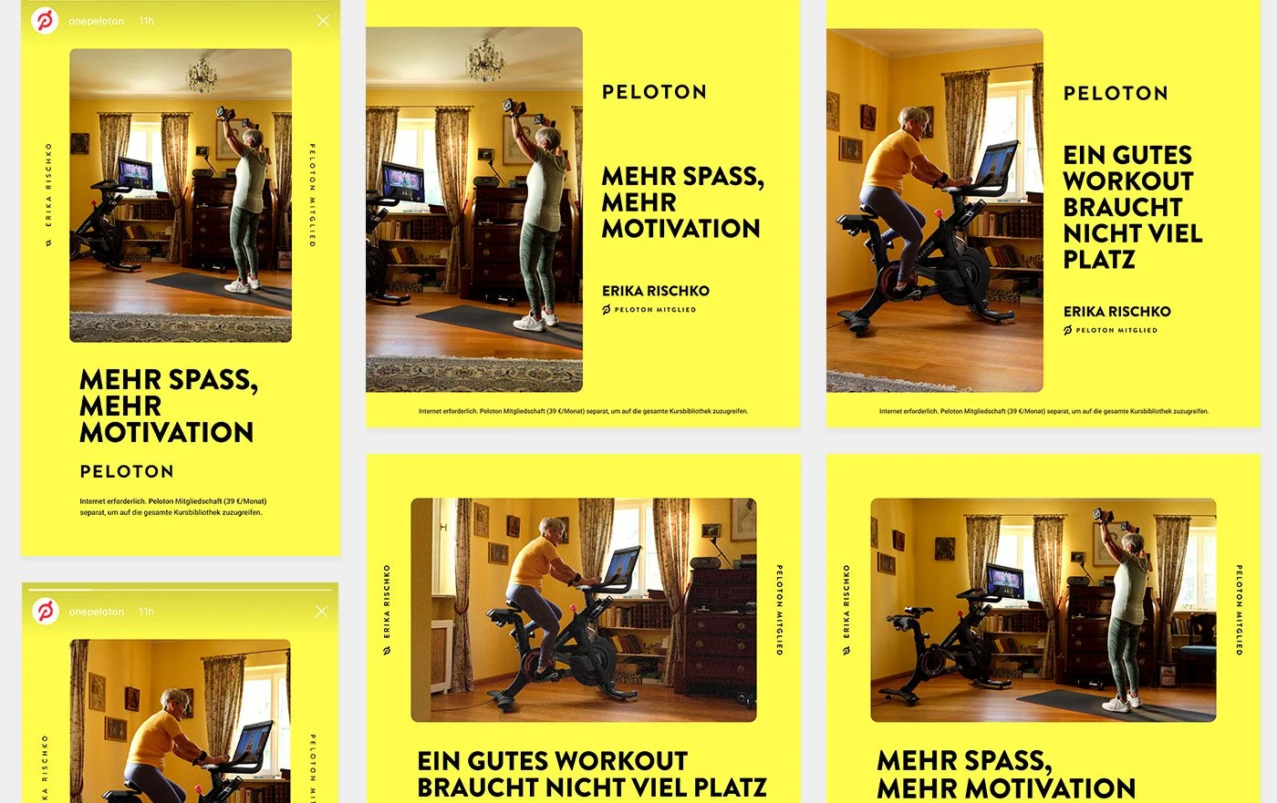 This campaign celebrated the incredible Peloton German member community. It focused on two members: Erika Rischko, a famous fitness Tiktoker, and Melanie Leupolz, a professional German football player. Off the back of the photoshoot with the members, I was responsible for developing the creative identity of the campaign across Peloton’s digital channels.