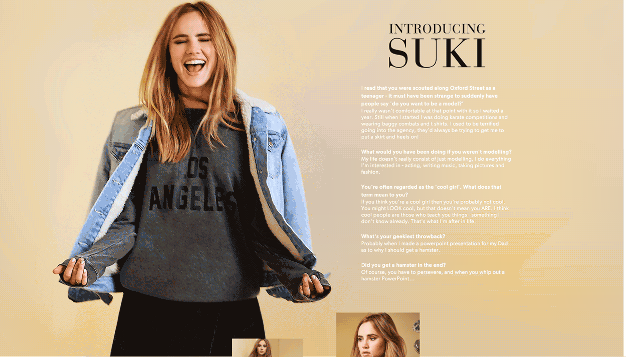 I designed and worked with the front end web developer to produce a responsive campaign page for New Look’s Suki Waterhouse campaign. I also designed the social and online marketing assets for this 360 campaign.